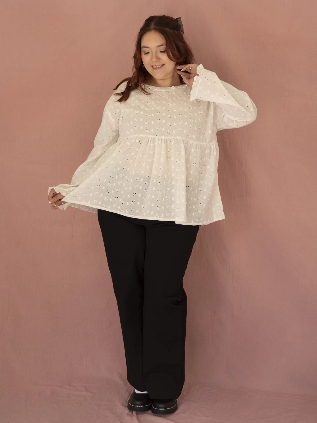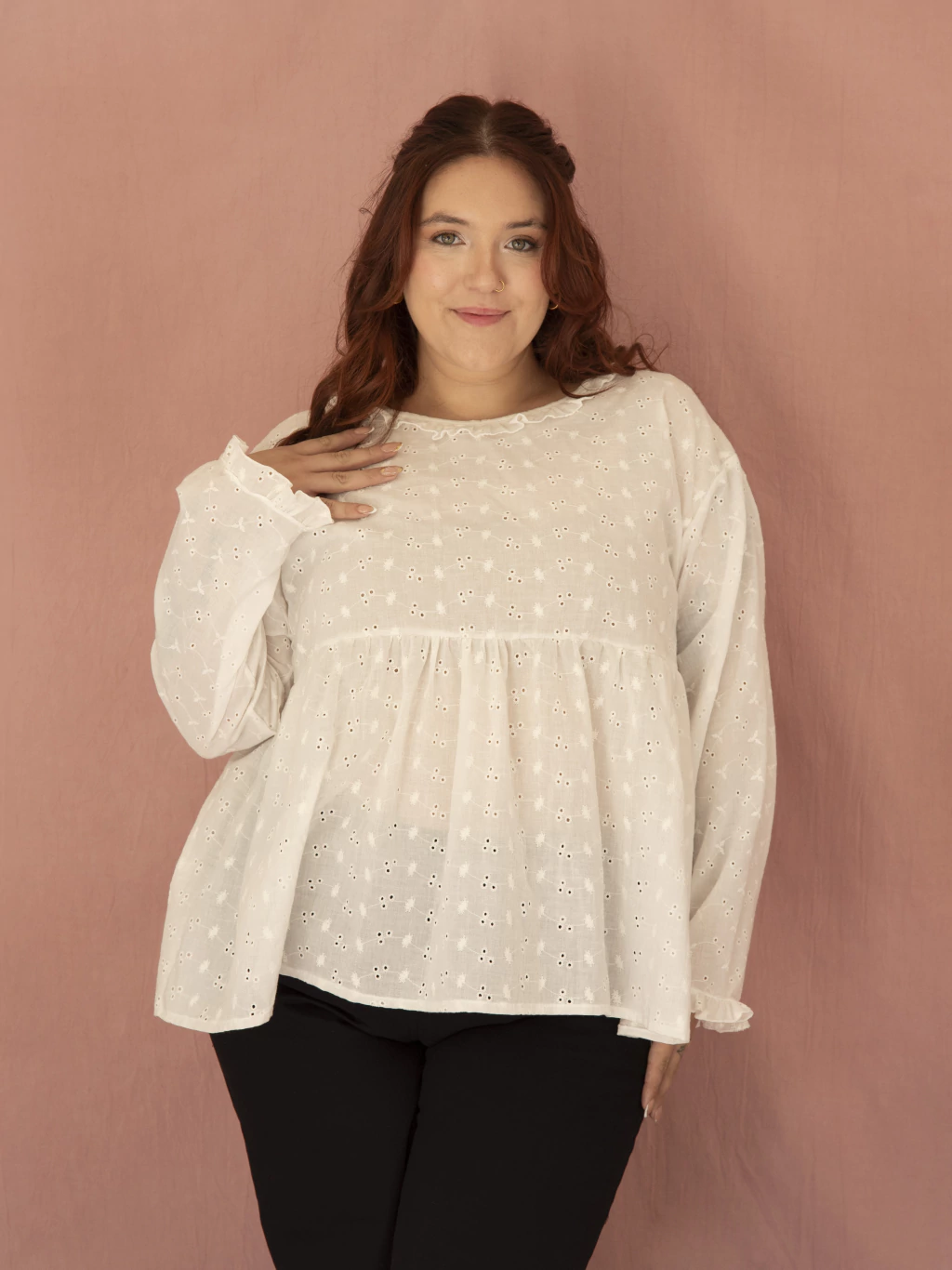 Nuestra blusa de broderie de algodón es una de esas prendas que enamoran a primera vista. Hecha de manera artesanal, con dedicación en cada detalle, tiene volados suaves en mangas y cuello que le dan ese toque romántico y soñador que tanto nos gusta.