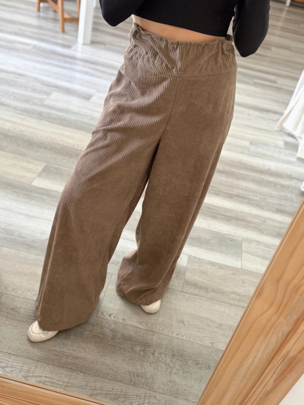 Pantalon palazzo con elastico en la cintura, corte muy holgado. Bolsillos amplios y tela de corderoy (abrigada).
